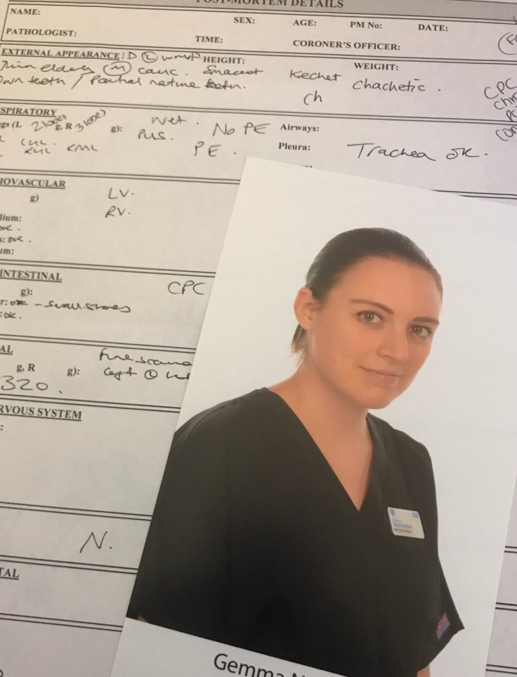 The photo below has an example of one of these sheets, all the scribbling on this is my practice beforehand and a colleague showing me how it works, it does not relate to any patient at all. The photograph of me overlaying the sheet is one taken for a poster showing all the mortuary staff. I think I look a bit scary and quite orange, but I’ve certainly looked worse. Funnily I look a lot worse on my actual staff pass where somehow I’m not even looking at the camera.