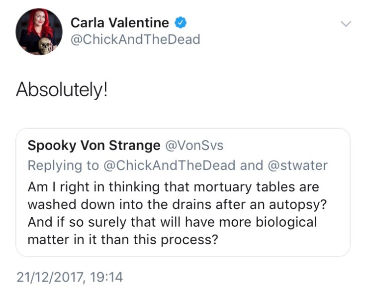 As you can see from this snapshot of Twitter, it has been pointed out that the process of post mortem actually washes an amount of human products away into the same system. I’m also not sure how different it is for the smoke of cremation to be pumped into the air compared to certain fluids being pumped into the water system, other than the fact we have a lot of hygienic and sanitary processes in place in our water system unlike the air that we breathe. If anyone has any thoughts on this I would be very interested to hear them.