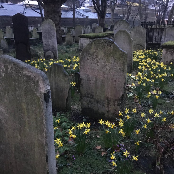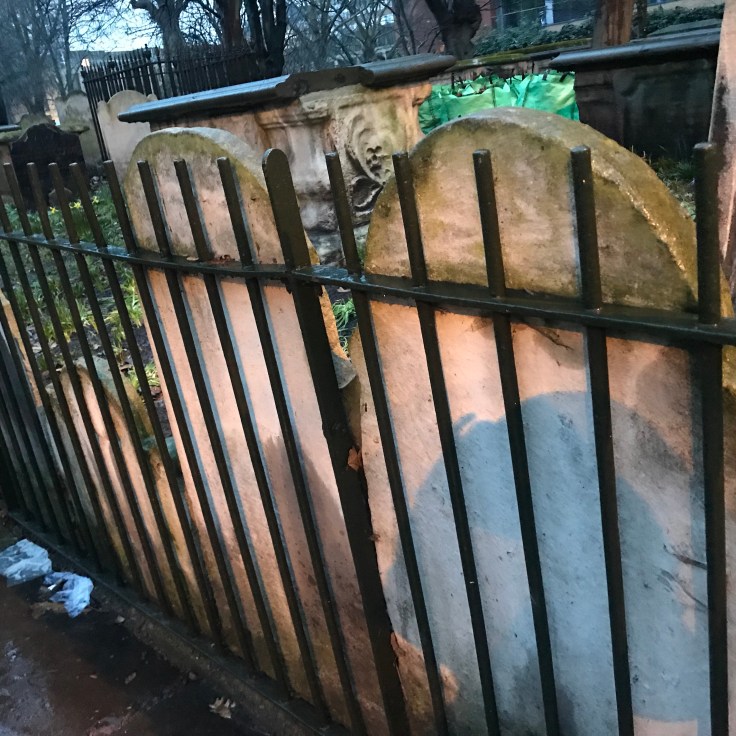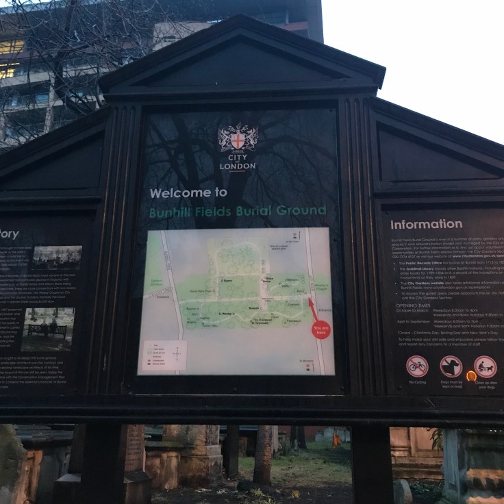 Later on in the evening, my other half and I did a mini pub crawl through Shoreditch in the city. In the penultimate pub, I was told ‘There’s another pub not far from here but we have to walk through a graveyard to get there’. So I grinned and agreed that one more pub on the other side of a graveyard was an excellent idea. Some mumbling about how I’m only interested in ‘blog fodder’ and a short walk later and I found myself wandering through the 4 acres and 120,000 graves at Bunhill Fields.
