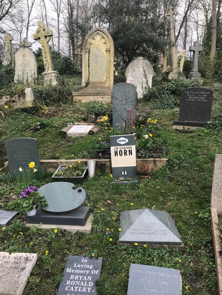 The East side has the resting places of many including Douglas Adams, Malcolm McClaren, Jeremy Beadle and, most famously, Karl Marx who’s grave is probably the main reason for people’s visits. His grave is impressive with a rather large bust of him adorning the top. There’s a great mix of traditional, older and newer graves on this site which is fascinating. Modern headstones branch out into many different areas, I’ve seen them in lots of different shapes which is a nice effect for your loved one. I think my favourite is the little painting palette that can be seen in the photo below.