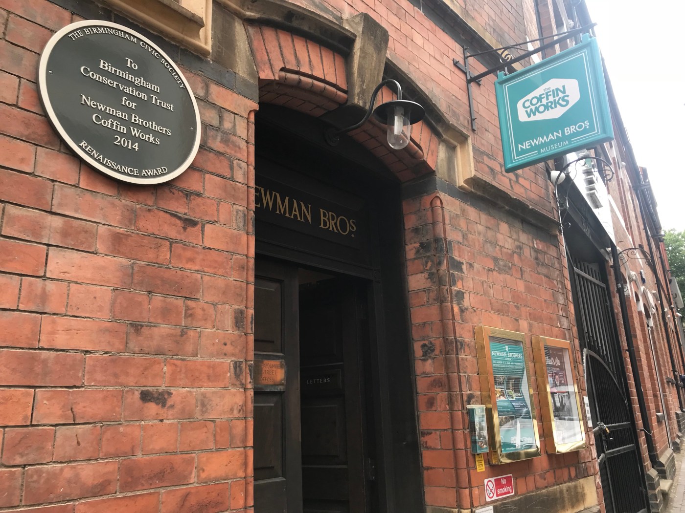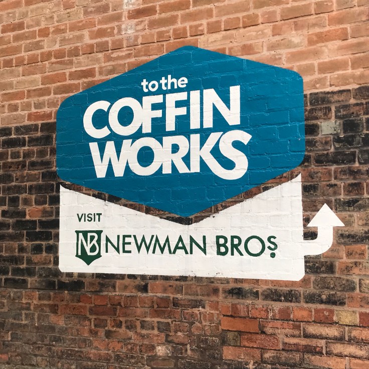 From there we drove about twenty minutes back into the city to visit an old factory known as Coffin Works. Coffin Works is the original home of the Newman Brothers coffin furniture business founded in 1894. Hidden away down Fleet Street, it’s only noticeable from a distance by the distinct turquoise signage outside. I picked up a leaflet for this place when I visited Abney Park cemetery with Laura D not realising it was in Birmingham but agreeing with myself that I would visit one day.