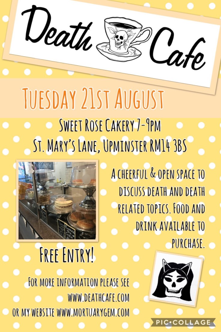 I spent the day off with my other half in London watching the Harry Potter play The Cursed Child which was great! I also did a little bit of Death Café planning and visited my parents who had their wedding anniversary, congratulations to them! The next Death Café has been confirmed as the 21st August at our lovely venue The Sweet Rose Cakery. I have made a very summery flyer as you can see below, and hope for record numbers at this event. Maybe the magazine article will be released in time for this one, but if not then September’s event could shape up to be very exciting also.
