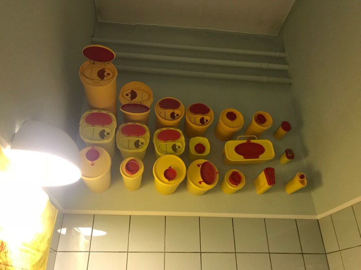 I try not to make a habit of taking photographs in toilets…. but this arty display of sharps bins caught my eye while using the facilities!