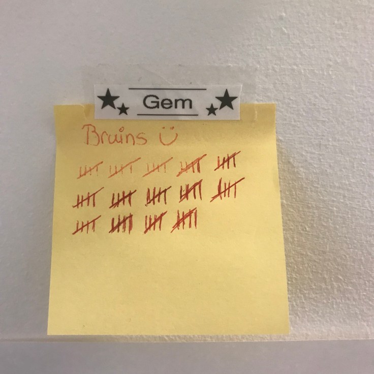 70 brains removed! My little post it stuck to the wall next to my desk.