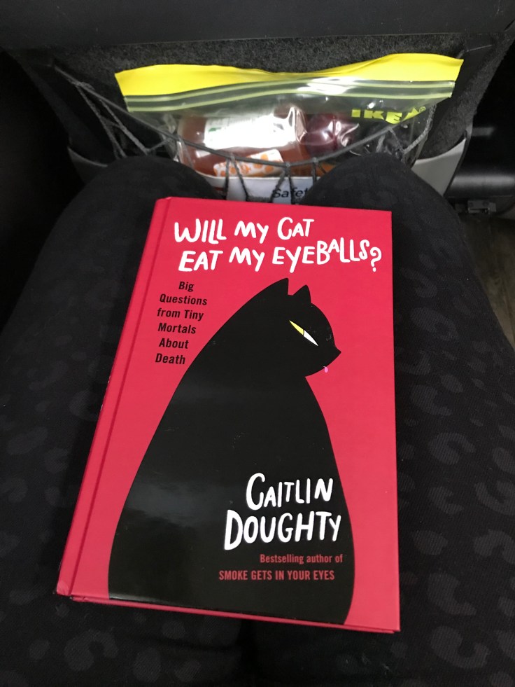 However I am three hours into my journey, it took an hour to get out of London but now we are well on our way North and I am feeling a little brighter after a snooze with my face smooshed up against the window. I was going to use this time to do some work, watch a couple of documentaries I had my eye on and listen to some cracking podcasts I had lined up. However, I desperately need to conserve my phone battery for my arrival to find my way to my hotel and my tablet is sat at a dwindling 59%. So how am I filling my time? Well I’ve always been quite pleased that books are a good back up, and they can’t run out of battery. I’ve got two with me, Will My Cat Eat My Eyeballs? By Caitlin Doughty is my first and I’m about thirty pages in and loving it. I’ve napped a lot and I’m quite good at napping in small spaces which I’m proud of. Seems to have shifted my headache too which is good. I’ve got a little supply oh healthy food and snacks keeping me going too.