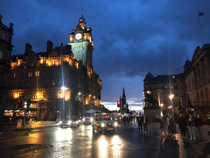 I arrived in Edinburgh on Friday night as the sun was finishing setting and the sky was a dark blue that was tinged with lighter patches through the clouds. The city was buzzing and I was full of anxiety about being in a mostly unknown place and largely on my own. I’d just spent eleven hours on a National Express coach absolutely wracked with nerves that gave me a headache. Only one thing for it, I dumped my heavy bag at the very nice Ten Hill Place hotel where I was staying and made myself go to the nearby Tesco Express for something to eat. Within fifteen minutes I was tucked up in the huge, comfy bed with a sandwich, a cup of tea and Bake Off Extra Slice on Channel 4+1. Perfect.