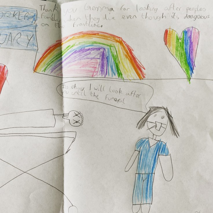 On Wednesday I came home to some awesome post from a lovely Death Cafe attendee who has a young son that is so death positive it’s absolutely inspirational. The below picture was drawn by him and he included to mention that the deceased has no skin because they donated it and you can clearly see that on top of their head is their brain showing. I am so in love with this I have put in on the wall above my desk to make me smile every time I see it. They also included some goodies which I’ve stashed away for the next time I need a sugar hit.