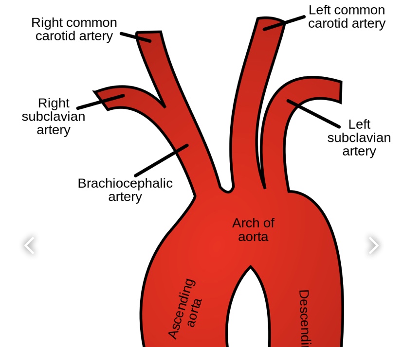 The carotid arteries, or common carotid arteries, are found leading from the aorta as it arches away from the heart and before it descends along the spine. There is a left and a right, which then further split each at a bifurcation into the internal and external. They are responsible for the blood supply to the head and neck. The internal carotids leading to the brain and the external leading to the face.