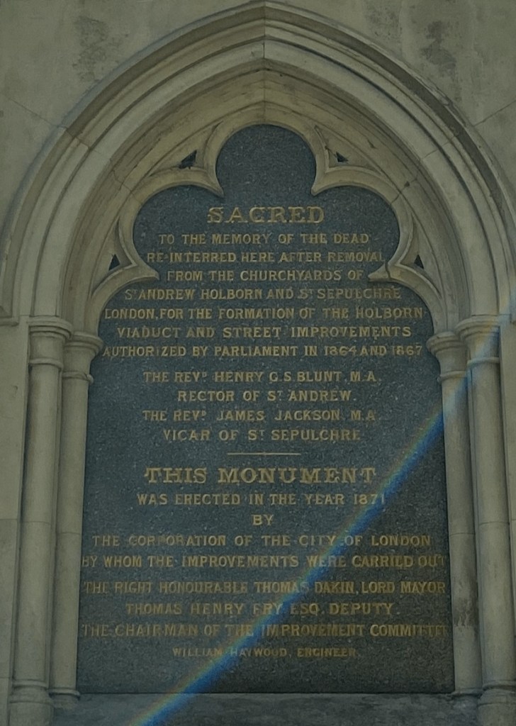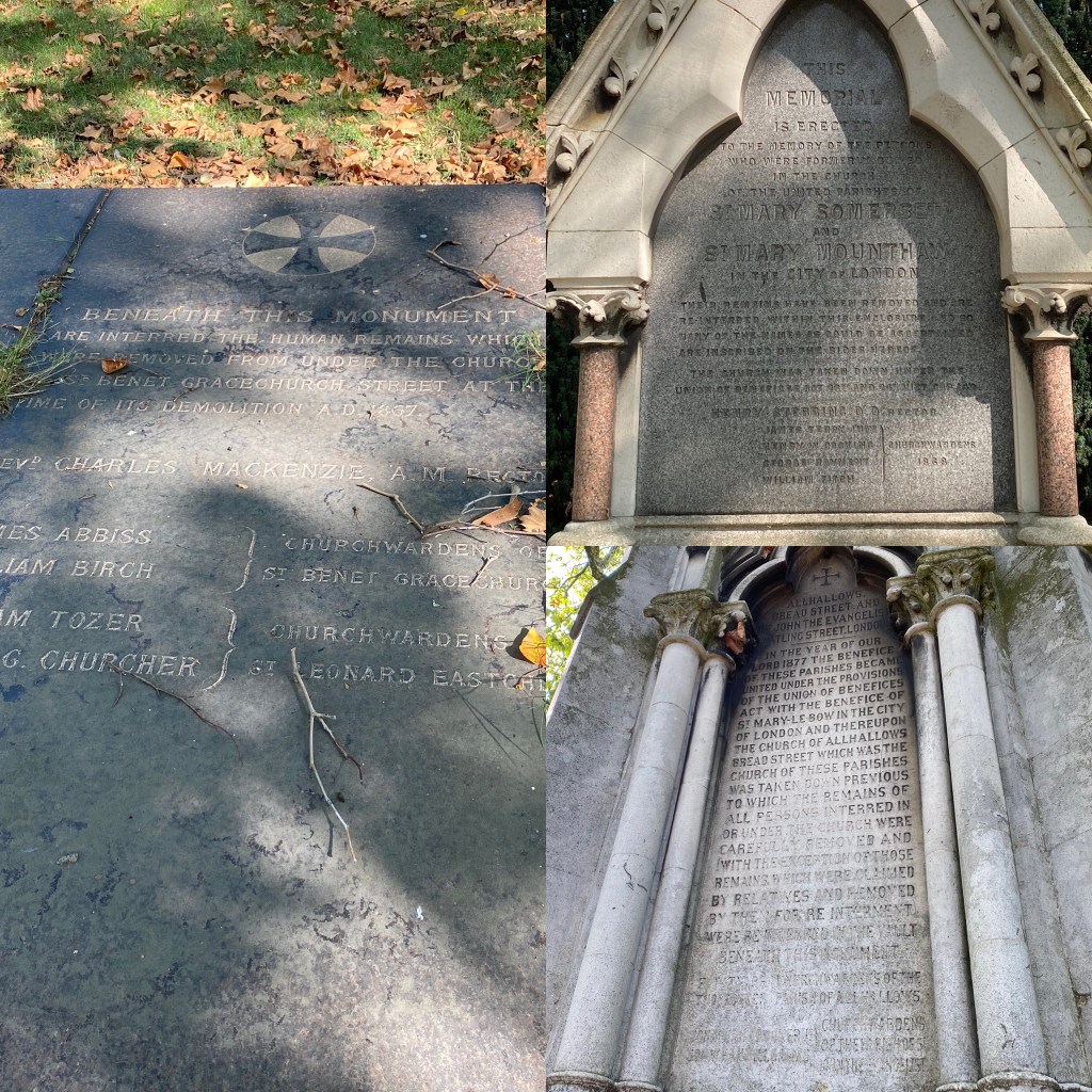 One aspect I found amazing are the bigger monuments which stand over the reinterred remains exhumed from the inner city churches destroyed to presumably make way for changes. One example you can see in the monument inscription below which shows the churches destroyed for the formation of the Holborn viaduct and other ‘improvements’ in the 1860s. Several of these monuments exist from various parishes of the inner city. They fascinate me and fill my head with imagined scenes of an old London with its tiny churches and churchyards. The history of cemeteries is something I am developing a love for, I’ve found myself being able to clearly spot the changes in grave style between late Victorian, mid last century and present day which is easy when you know what to look out for.
